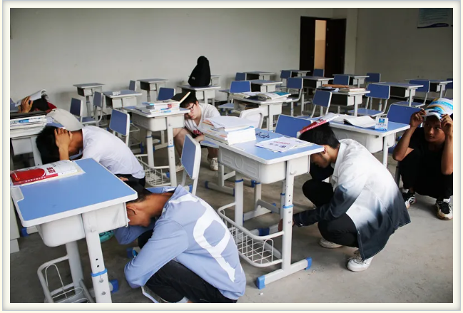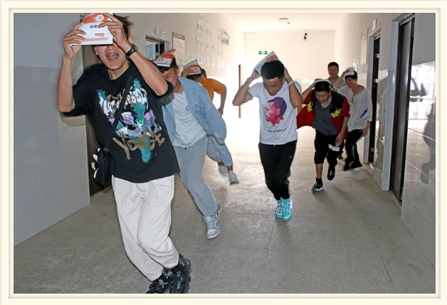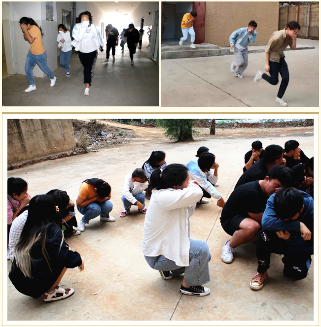17:30分,消防、防震演練正式開始。當(dāng)火災(zāi)警報聲響起時,學(xué)生們在上課老師的組織下,用衣服、毛巾等捂住口鼻,彎腰、弓背,沿預(yù)定消防路線迅速、有序撤離教室,到達教學(xué)樓前的空地集合并清點人數(shù)。在地震演練中,當(dāng)聽到地震警報聲,同學(xué)們迅速躲在課桌下,隨后在任課教師的指揮下,用書包、書等遮擋住頭部,沿預(yù)定撤離路線快速撤離到教學(xué)樓前的空地集合并清點人員,完成防震演練。