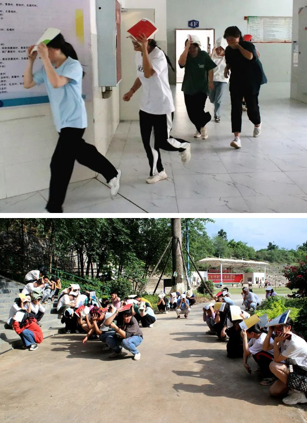 下午4時,隨著一陣尖銳而又急促的警報聲響起,正在教室上課的各班同學在科任老師的指揮下,迅速進行避險和逃生演練。在地震演練中,聽到第一次警報聲后,同學們立刻躲在桌子底下,雙手抱頭,做好自我防護。聽到第二次警報聲后,師生立即開始快速有序疏散,按指定路線撤離到教室外的空曠地區,大家俯身避險并使用書本等物品保護頭部,班長清點人數并上報。