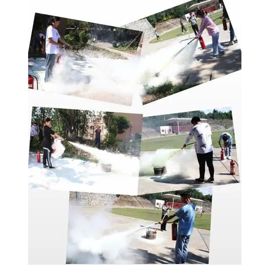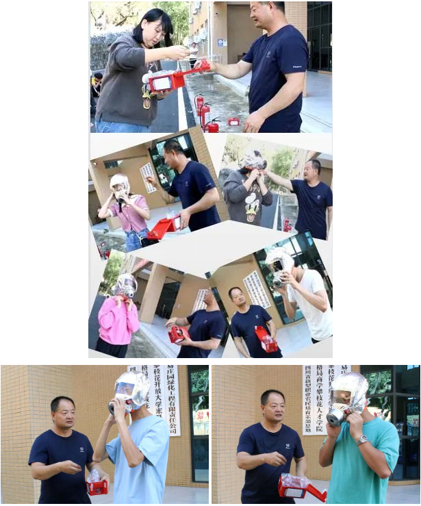 他演示了干粉滅火器和過濾式消防自救呼吸器的使用方法,并讓同學親自實踐,同時給予指導。