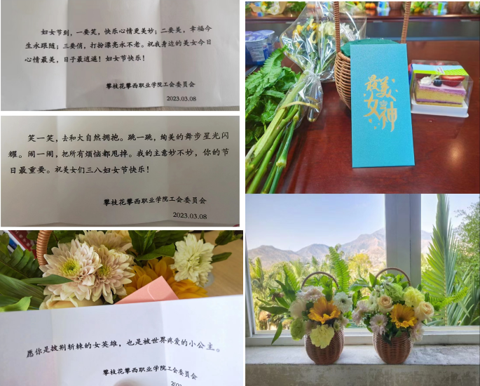 學院工會向所有在崗辛勤勞動的女職工們發放節日紅包,紅包內還有不一樣的節日祝福語。含苞待放的玫瑰,清新淡雅的康乃馨,金色活潑的向日葵,……一束束色彩斑斕的鮮花整齊有序的擺放在桌面上,拉開了女神節活動的帷幕。