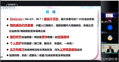 鐘南山院士總結了兩年多來抗疫取得的成就,系統地分析了全國范圍和第二波奧密克戎疫情的特點,介紹奧密克戎的生物學特征、致病性以及如何科學地防范病毒。同時對于加強個人防護提出了8條建議:即加強防護(戴口罩、保持距離、減少公眾聚集等);不應為感染而害怕;大多數感染者不需要去醫院;居家注意常做抗原檢測;若持續發熱一定要去醫院;患一般慢性病的老年人也要打疫苗;囤藥沒有太大必要;“老藥新用”要經嚴格實驗。