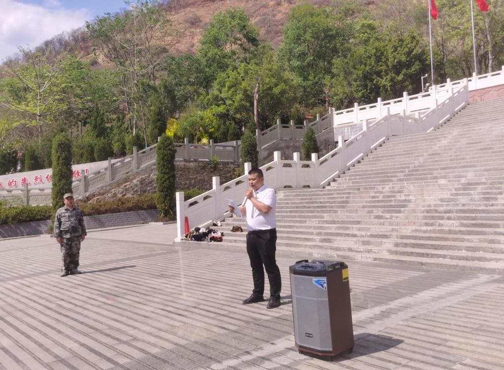 巍巍靈官山,滔滔安寧河。米易縣烈士陵園內翠柏掩映,郁郁蔥蔥,在莊嚴肅立英雄紀念碑下,全體師生整齊列隊,神情肅穆,靜靜等待活動開始。下午3時30分,活動開始,全體師生奏唱團歌,向烈士紀念碑肅立默哀,團委書記劉興科同志宣讀祭文。