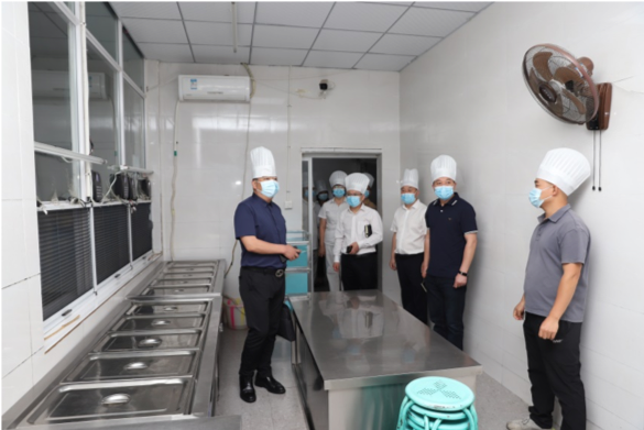 專家組組長陳向華(中)一行在潘吉平副院長(前)陪同下在食堂現場檢查