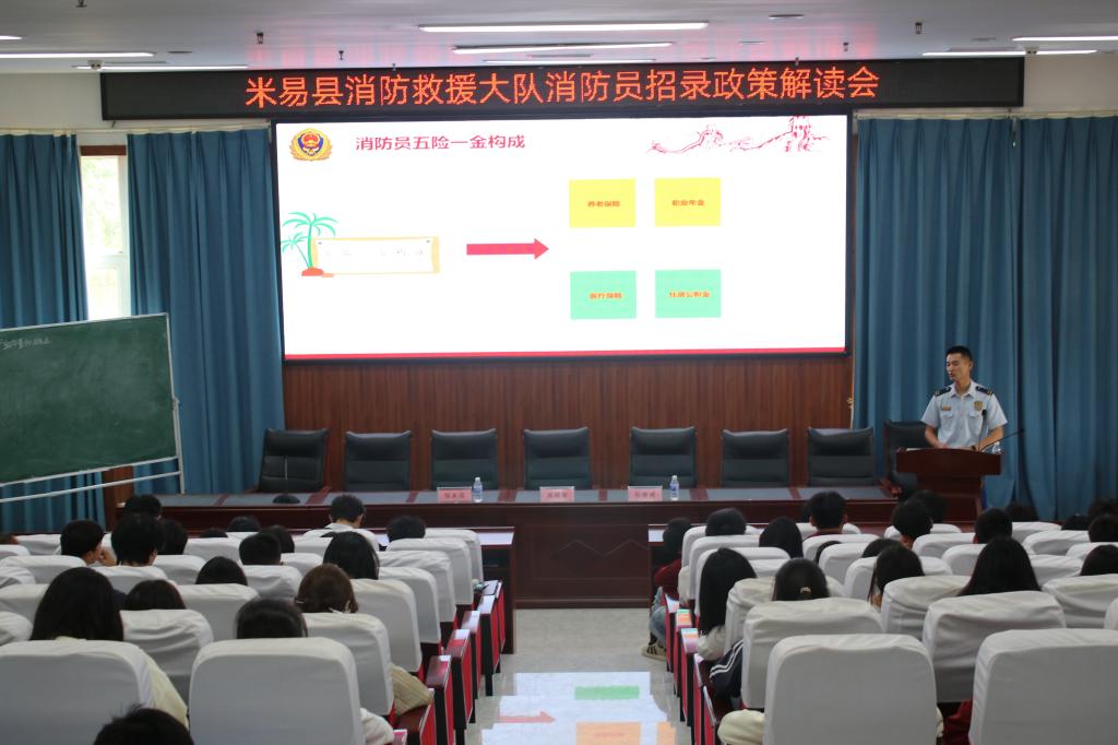 隨后,商曉客副站長用一幀幀圖片帶大家領略消防員們的日常工作。消防救援隊伍作為離老百姓最近、聯系最緊密的隊伍,他們用自己過硬的本領和精湛的技能來守衛城市萬家燈火。接著,他從如何才能當上一名光榮的消防員、消防員需要具備的個人素質等方面開啟消防員征招政策宣講。對消防員招錄條件及范圍、招錄程序、編制及退出的安置政策、工資待遇及休假政策、職業發展空間等五個方面解讀消防員征招錄用的政策條件。同時還介紹了消防員的招錄需要通過報名、資格審查、體檢、政審、體測、心理測試等9個程序。他表示,時代呼喚英雄,百姓盼望平安,正氣需要弘揚。希望同學們積極加入消防救援隊伍這個大家庭。