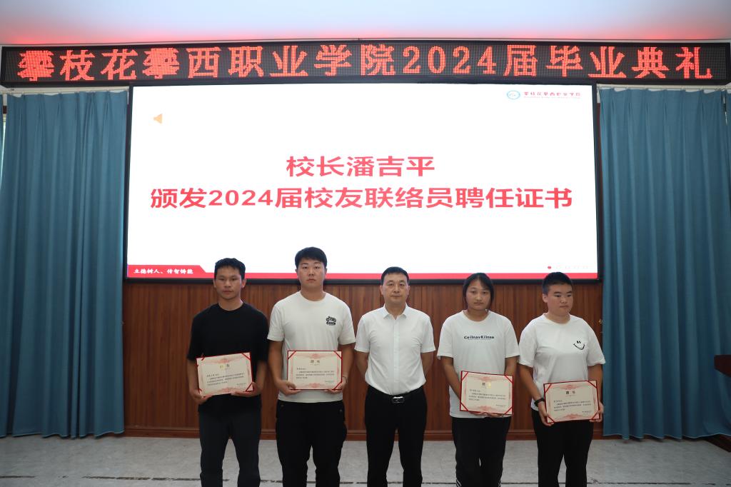 副校長(zhǎng)鄒永亮宣讀《攀枝花攀西職業(yè)學(xué)院關(guān)于聘任2024屆畢業(yè)生校友會(huì)聯(lián)絡(luò)員的通知》。校長(zhǎng)潘吉平為校友聯(lián)絡(luò)員頒發(fā)聘書(shū)。