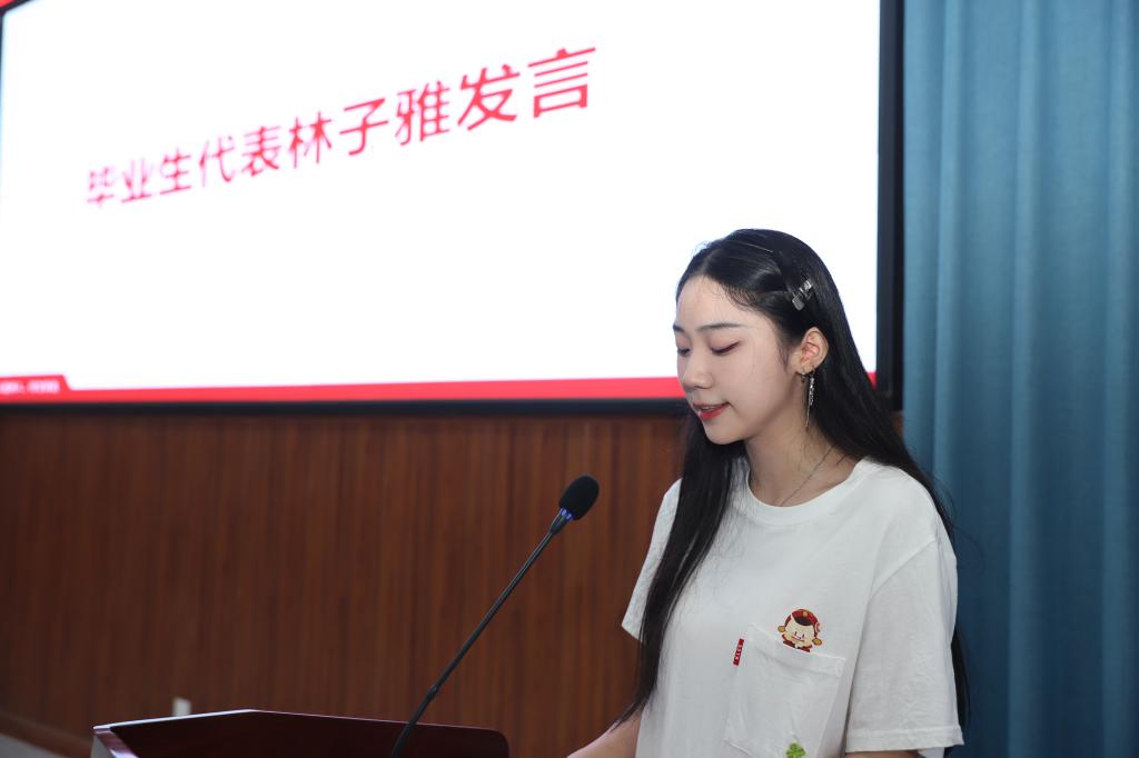 畢業(yè)生代表林子雅發(fā)言:“今朝畢業(yè),不訴離傷,他日重逢,各領(lǐng)風(fēng)騷!至此畢業(yè)之際,祝愿老師們身體健康,工作順利!祝愿同學(xué)們前程似錦、一帆風(fēng)順!祝愿母校桃李芬芳、再創(chuàng)輝煌!”