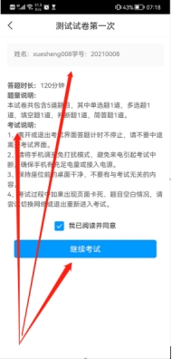 ⑦閱讀答題時長、題量說明、考試說明并勾選【我已閱讀并同意】按鈕---點擊【繼續考試】---點擊【進入考試】;