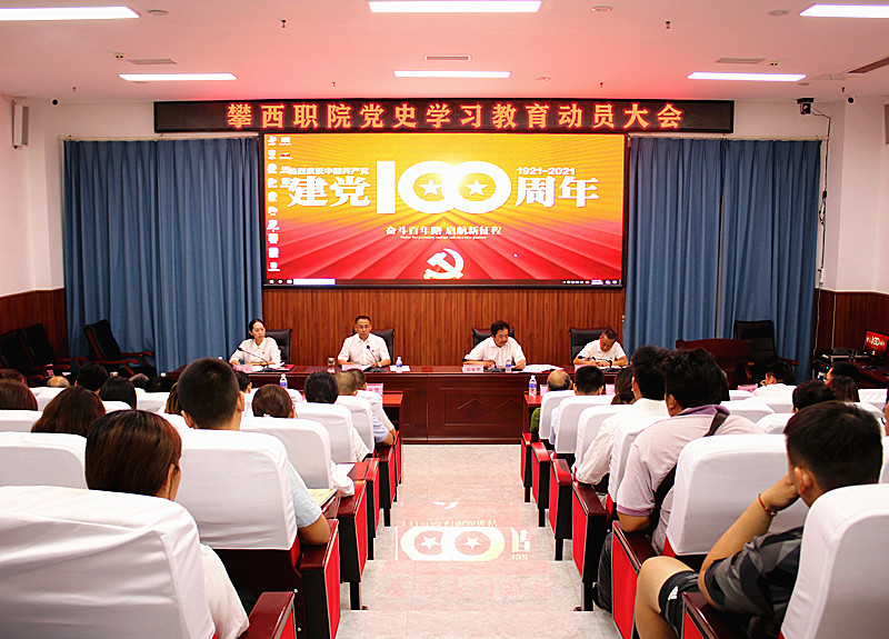 2021年是中國共產黨成立100周年,中央決定在全黨深入開展黨史學習教育。按照省委教育工委的安排部署,2021年5月18日下午,攀西職院在二實訓樓階梯教室召開黨史學習教育動員大會,學院理事長張家華,副理事長、執行院長趙海林,副院長周再玉出席大會,學院全體共產黨員,中層以上干部,全體教職員工參加大會。副院長周再玉主持會議。