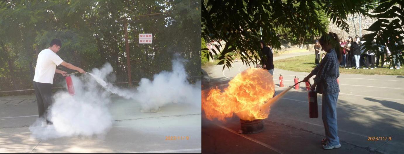 講座后,集合同學們進行消防器材的實操。倪繼成先對消防器材的滅火原理和安全注意事項進行講解,并親自演示使用干粉滅火器滅火的操作方法。隨后,部分同學體驗實操。通過實操體驗提高了同學們使用消防器材撲滅初起火災的能力。