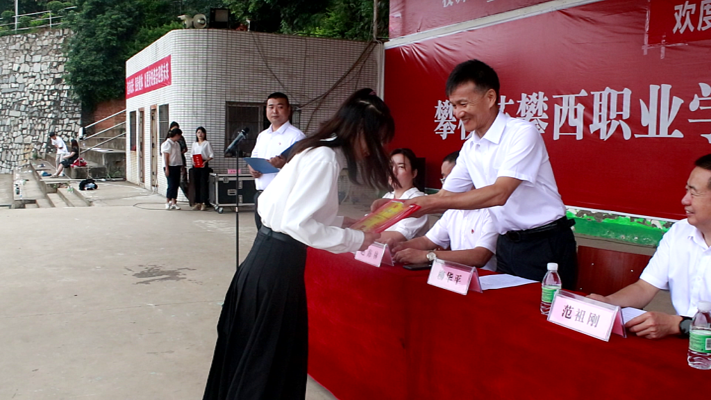 機電工程系輔導員張妮教師獲得優秀指導員,米易縣委教育工委書記、縣教育和體育局局長柳華平為其頒獎。