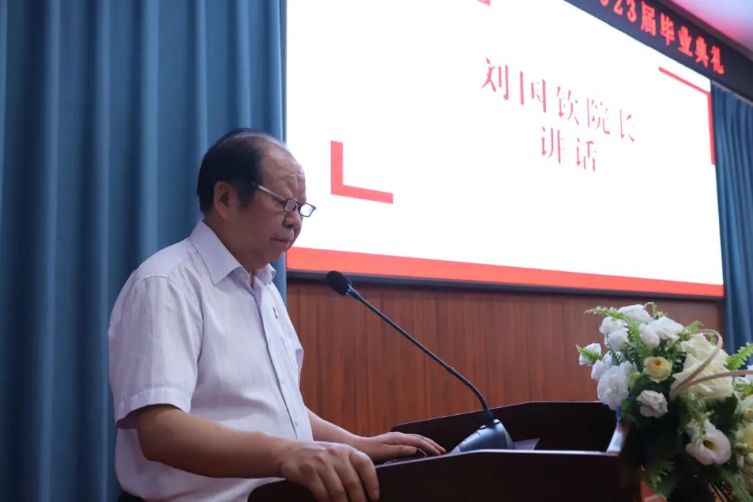 學院副院長李玉德宣讀畢業生名單。院長劉國欽依次為機電工程系、現代農業系、基礎教學與公共管理系畢業生代表頒發畢業證書,逐一佩戴印有學院校訓的綬帶,與同學們親切交談,并留下珍貴合影。