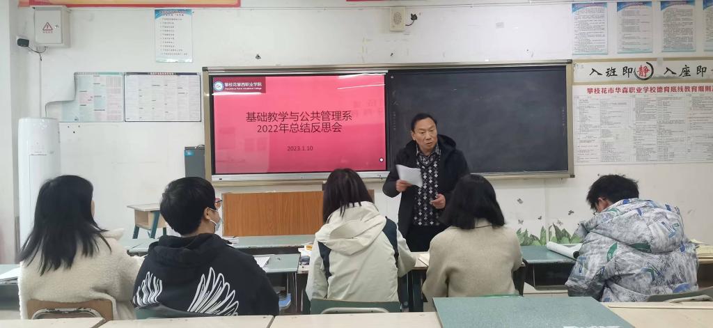 基礎(chǔ)教學(xué)與公共管理系于2023年1月10日15:00時(shí),在教學(xué)樓212召開(kāi)2022年總結(jié)反思會(huì)。本次例會(huì)基礎(chǔ)系全體教師參加,主任伍亞林主持。針對(duì)本次攀枝花攀西職業(yè)學(xué)院對(duì)系部和中層干部考核工作,伍主任作了以下總結(jié)反思: