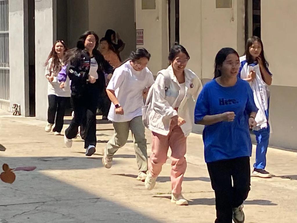 隨著又一聲應急疏散警報信號響起后所有人迅速反應沖出房門有秩序的撤離“火災現場”,各樓道疏散員也迅速引導學生有序、安全的下樓,各路撤離隊伍快速而不擁擠地沿著指定路線到達了臨時疏散地點。
