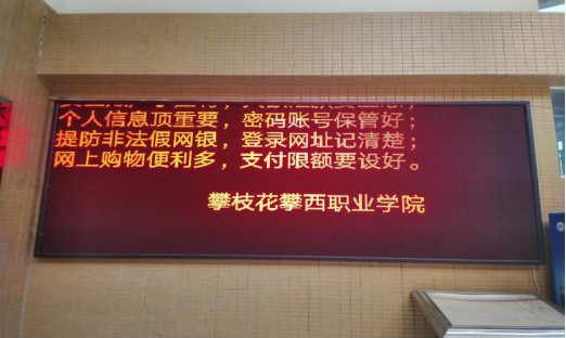 攀西職院后勤保衛處利用LED在學院內宣傳,輔導員利用QQ、微信及展板再次對學生進行防電信網絡詐騙相關知識宣傳。