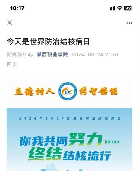 2024年3月24日是第29個“世界防治結核病日”,今年的主題是“你我共同努力 終結結核流行”,我院通過LED屏的投放、班會、看視頻、公眾號的形式使學生了解各種傳染病知識以及傳染病的防控,提高大家的健康意識。