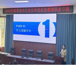 為響應國家衛生健康委辦公廳印發的《國家衛生健康委辦公廳關于開展 2023年世界卒中日主題宣傳活動的通知》 (國衛辦醫急函[2023]372號)文件,關愛學生健康,提高學生健康意識,宣傳健康理念,米易縣中醫院派遣醫務人員于2023年11月2日到攀枝花攀西職業學院現代農業系開展健康知識科普講座。