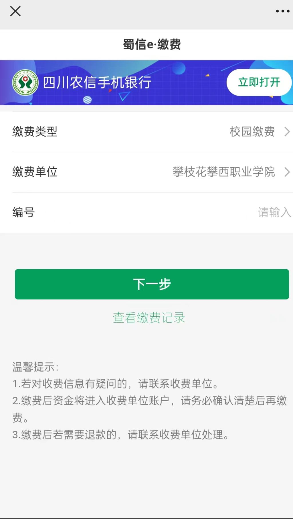 1.用微信、手機農商行APP掃描學院農信二維碼,進入網上蜀信e繳費系統。