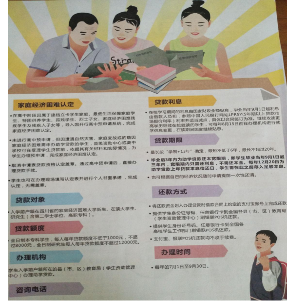為了“不讓一個(gè)學(xué)生因家庭經(jīng)濟(jì)困難而失學(xué)”近日,縣教育局下發(fā)了四川省國家開發(fā)銀行生源地信用助學(xué)貸款宣傳單,我校立刻對(duì)參加2020年升學(xué)考試的所有學(xué)生進(jìn)行大學(xué)生生源地信用助學(xué)貸款優(yōu)惠政策宣傳。并下發(fā)助學(xué)貸款申請指南等形式,指導(dǎo)學(xué)生做好資格認(rèn)定工作。通過介紹生源地助學(xué)貸款政策、還款流程、學(xué)制及賬戶變更等相關(guān)要求,提高助學(xué)貸款工作的準(zhǔn)確性和辦理效率,避免學(xué)生及家長多次往返奔波