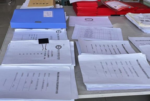 機電工程系全體教師整理好各自的教學資料,如教案、教學大綱、教學日歷、學生考勤表等相關文件,并將其放置系部辦公桌上,程茜老師對相關教學文件做出解釋,并記錄整改意見。