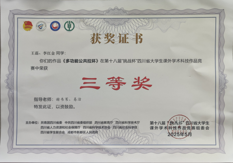 上一條:2022年“挑戰(zhàn)杯”中國(guó)農(nóng)業(yè)銀行四川省大學(xué)生創(chuàng)業(yè)計(jì)劃競(jìng)賽(省級(jí)銅獎(jiǎng)) 下一條:2023睿抗(RAUCOM)機(jī)器人大賽(榮獲三等獎(jiǎng)、優(yōu)秀獎(jiǎng))