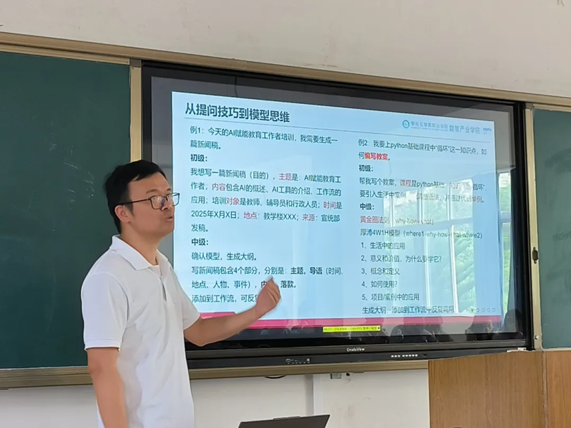 接著,何舸老師以“AI賦能教育工作者”為主題,講解了人工智能技術如何助力教育教學,實現人機協同、減負增效的智能工作新模式。他一邊操作AI應用軟件,一邊通過具體事例展示了AI技術在教學管理、教學準備、教學過程中等方面的應用,激發了教師們對智能教育新形態的深入思考,助力大家在教學工作中應用人工智能技術開拓工作思路,學習先進職教理念,創新發展教育教學工作。