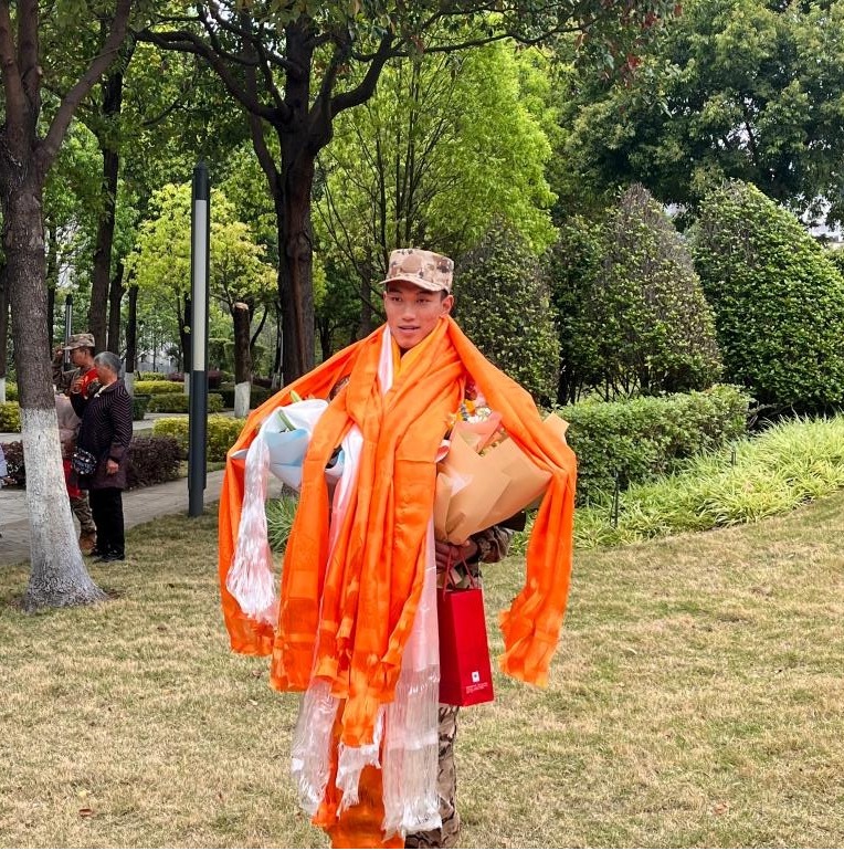 輔導(dǎo)員潘老師代表學(xué)院向澤郎李羅同學(xué)表示祝賀,并勉勵(lì)他在軍營(yíng)中錘煉意志、增長(zhǎng)才干:“參軍報(bào)國(guó)是當(dāng)代青年的崇高追求,希望你能發(fā)揚(yáng)‘健康人’堅(jiān)韌不拔的精神,在部隊(duì)大熔爐里成長(zhǎng)為有擔(dān)當(dāng)、有本領(lǐng)的新時(shí)代軍人。”學(xué)生代表則送上飽含祝福的哈達(dá)和鮮花,感慨道:“澤郎李羅同學(xué)一直是我們的榜樣,他主動(dòng)投身國(guó)防的選擇讓我們深受鼓舞!”