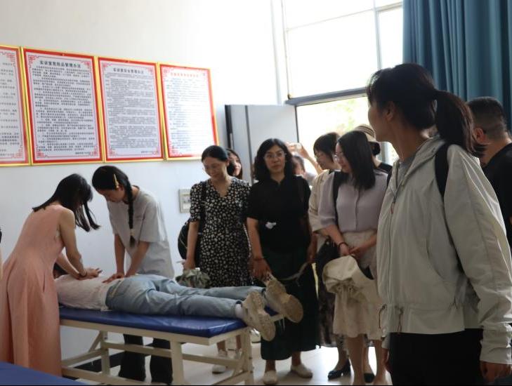 在學院領導的陪同下,專家組一行實地考察了人體形態學實訓室、急救室實訓室、健康評估實訓室、中醫養生保健實訓、中醫針灸推拿實訓室、中醫藥膳實訓室、嬰幼兒保健實訓室等實訓教學場地。學院相關負責人詳細介紹了實訓室的設備功能、教學模式及學生實踐成果,展示了健康管理產業學院“理論+實踐+產業應用”的一體化培養體系。專家組對中醫藥膳等特色項目給予了充分肯定,對當地康養產業有著十分重要的意義。中醫2023級學生展示了推拿按摩實訓課場景,受到了專家組的一致好評。